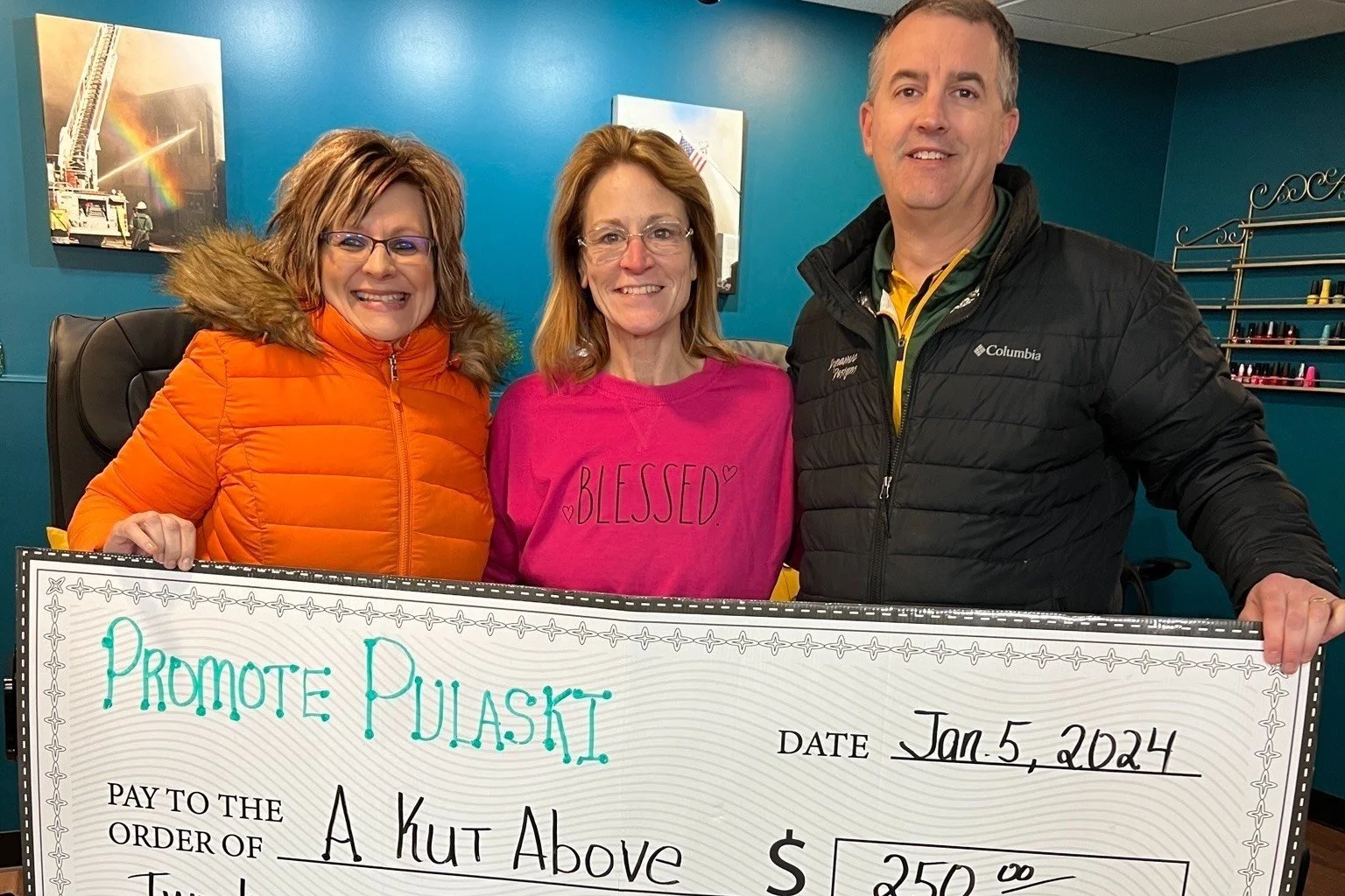 Promote Pulaski award a business relief check to A Kut Above recently to assist with relocation from recent downtown fire in Pulaski, Wisconsin
